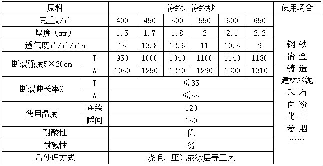 滌綸針刺過濾氈是制做常溫除塵布袋的理想材料,滌綸針刺氈采用中石化化生產的高標準滌綸纖維,按照國標GB12625-90標準生產,加工制作的過濾材料,為常溫過濾材料的主要品種。滌綸又稱聚酯,無論在干、濕性狀態(tài)下變化不大。它對絕大部分常溫中的氛圍提供良好的抵抗力。適應場合: