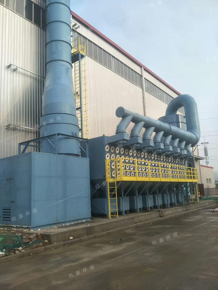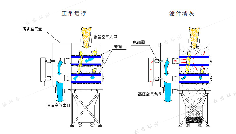 濾筒除塵器的主要構(gòu)造是由除塵室、脈沖反吹清灰系統(tǒng)和集塵室組成。當(dāng)含塵空氣進(jìn)入除塵室后,被圓筒形的濾筒材質(zhì)阻隔,亞微米以上的粉塵被阻留在濾筒外表面上,過濾凈化后的氣流就從濾筒