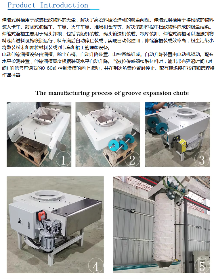 服務電話:13091153069(同微信)伸縮式卸料管是一種物料處理設備,用于將粉末和干散狀物料無塵地裝入或卸入容器、卡車和船只。它是一種自動化且靈活的解決方案,可以根據(jù)不同行業(yè)的需求進行定制。伸縮式卸料管系統(tǒng)的主要功能是通過垂直的鐵管利用物料自身的重量排放粉末或顆粒狀散裝固體,同時通過外層的一層帆布材料的布筒收集卸料時產(chǎn)生的粉塵。為了適應上部排放點和下部裝載點之間的不同高度,鐵管被設計為可伸縮的。鐵管的靈活性是伸縮式卸料管系統(tǒng)的關鍵特性,它允許根據(jù)不同的排放和裝載點進行調整,使其成為廣泛應用的多功能解決方案。